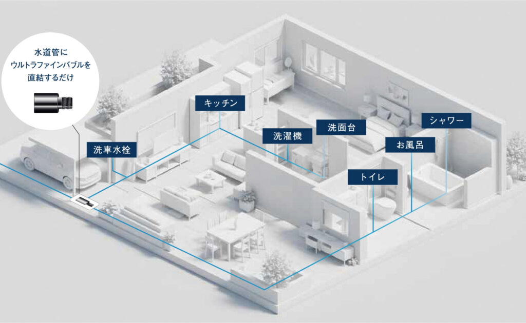 具体的には、キッチン、浴室、トイレ、洗面台など、家中すべての水回りでウルトラファインバブル水が使えます!