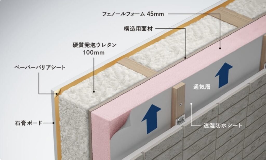 ・充填(内壁)断熱:吹付発泡ウレタン100mm